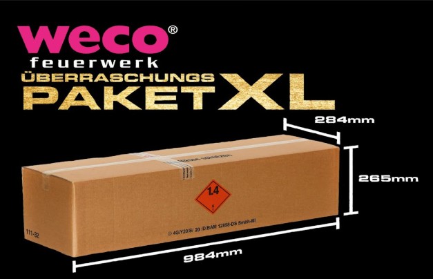 Das Überraschungspaket XL enthält einen bunten Mix an Feuerwerksartikeln der Kategorien F1 und F2: Batterien der 200g und 500g-Klasse, Verbundfeuerwerke, teilweise Raketen, Familienartikel, Leucht- und Knallartikel, Party- und Jugendfeuerwerk.